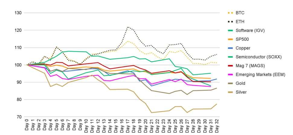 De când a început conflictul cu Iranul în 2026, Bitcoin a crescut cu 1%, iar Ethereum cu 6% în primele 32 de zile (ajungând temporar și la +14%, respectiv, +22%). În aceeași perioadă, piețele tradiționale au scăzut puternic: S&P 500 a pierdut 8%, cele mai mari 7 companii tech (Mag 7) au coborât 10%, sectorul semiconductorilor 12%, piețele emergente 13%, cuprul 8%, iar aurul și argintul, considerate de obicei active sigure și de refugiu, au înregistrat pierderi de 13% și, respectiv, 22%.